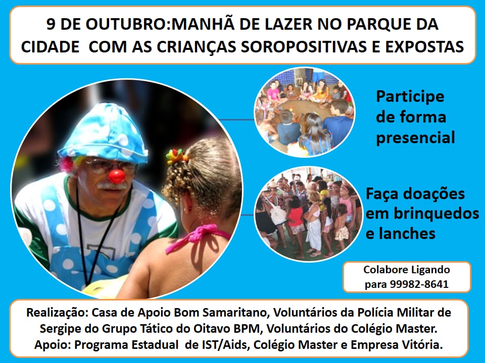 Em alusão ao dia das crianças, celebrado em 12 de outubro, o Programa Estadual de IST/AIDS da Secretaria de Estado da Saúde  (SES) está apoiando a realização da manhã de lazer no Parque da Cidade, voltada para crianças soropositivas e expostas. A ação que já acontece há 10 anos, será realizada no próximo dia 09 de outubro e está aberta à colaboração da sociedade através da doação de brinquedos e lanches.
