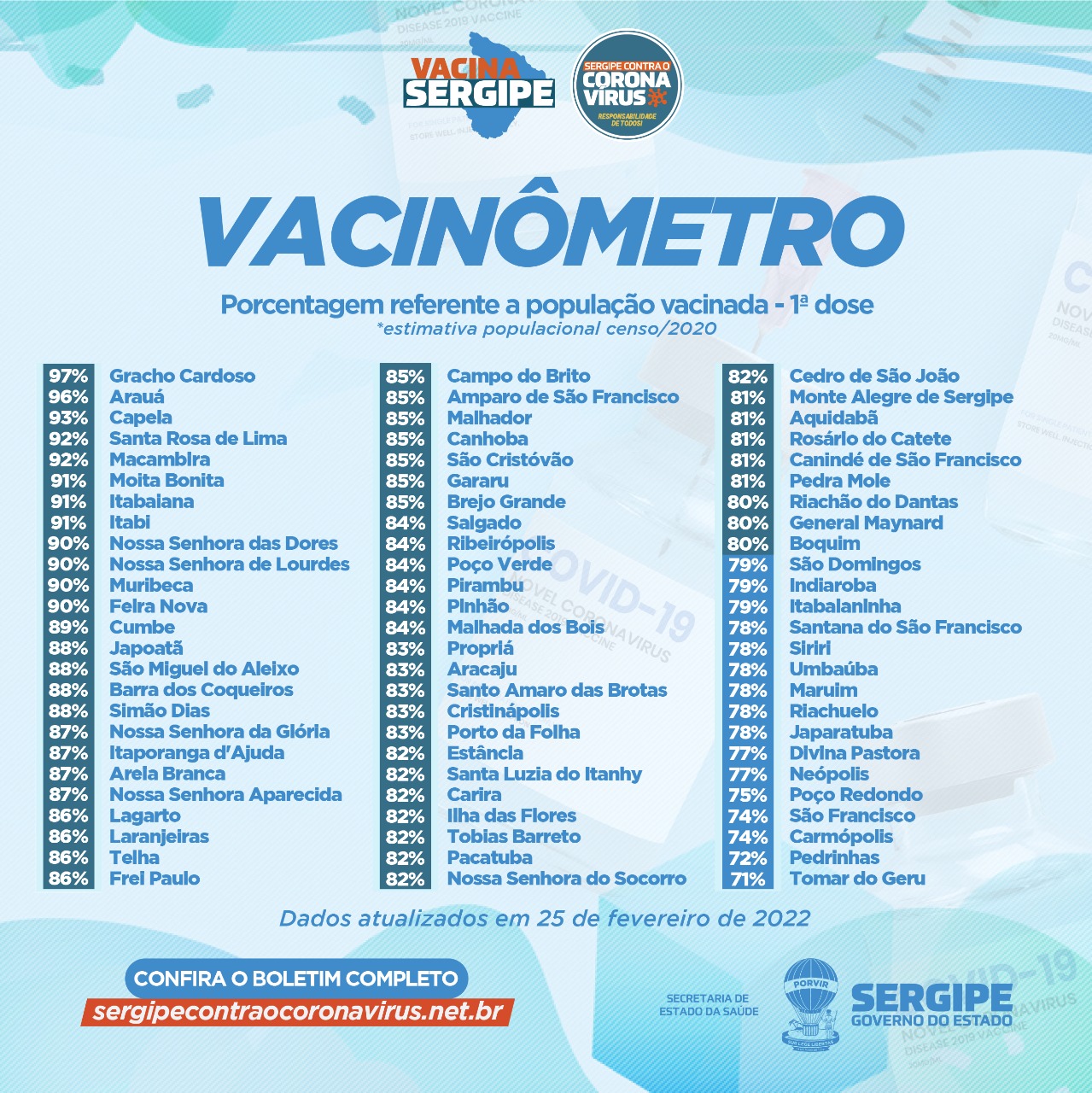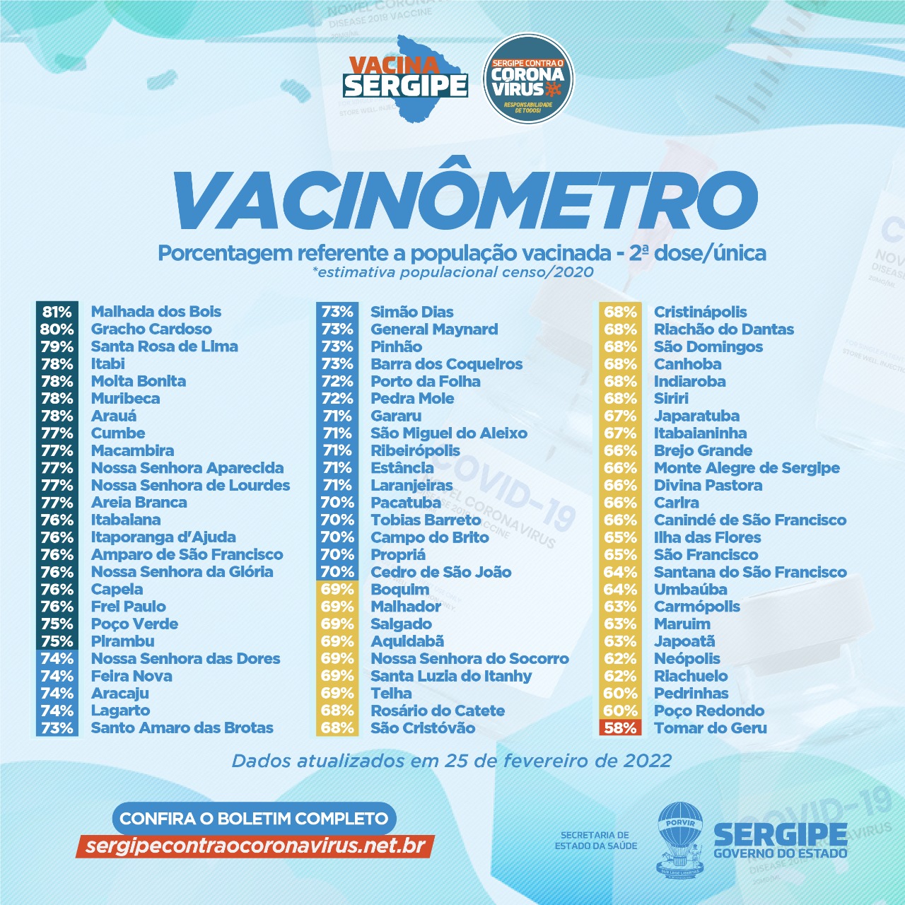 Foram enviadas aos municípios 4.572.617 doses. Destas, 1.895.684 foram aplicadas como primeira dose; 1.614.208 como segunda dose; 40.125 como dose única e 655.264 como dose de reforço. A cobertura vacinal de primeira dose está em 83,48% e 71,34% estão com a imunização completa.