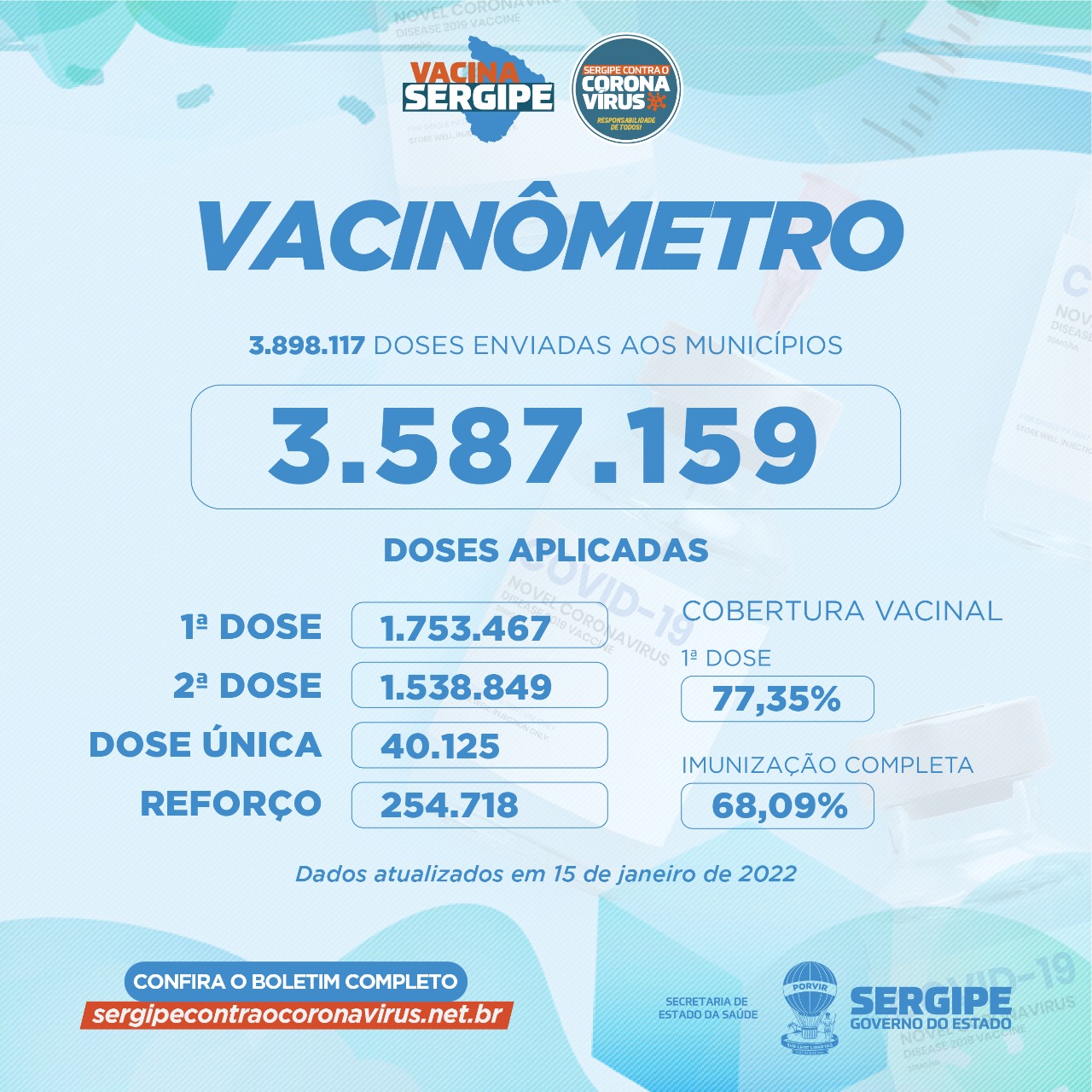 Foram enviadas aos municípios 3.898.117 doses. Destas, 1.753.467 foram aplicadas como primeira dose; 1.538.849 como segunda dose; 40.125 como dose única e 254.718 como dose de reforço. A cobertura vacinal de primeira dose está em 77,35% e 68,09% estão com a imunização completa.